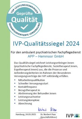 und mit dem IVP-Qualitätssiegel 2024 versehen wurden wir von der IVPNetworks GmbH, unserer Partnerin im Bereich der Besonderen Versorgung. Das Qualitätssiegel zeichnet Leistungserbringer aus, die die Prozesse und Anforderungskriterien im Rahmen der Besonderen Versorgungsverträge der IVP vollständig erfüllen.